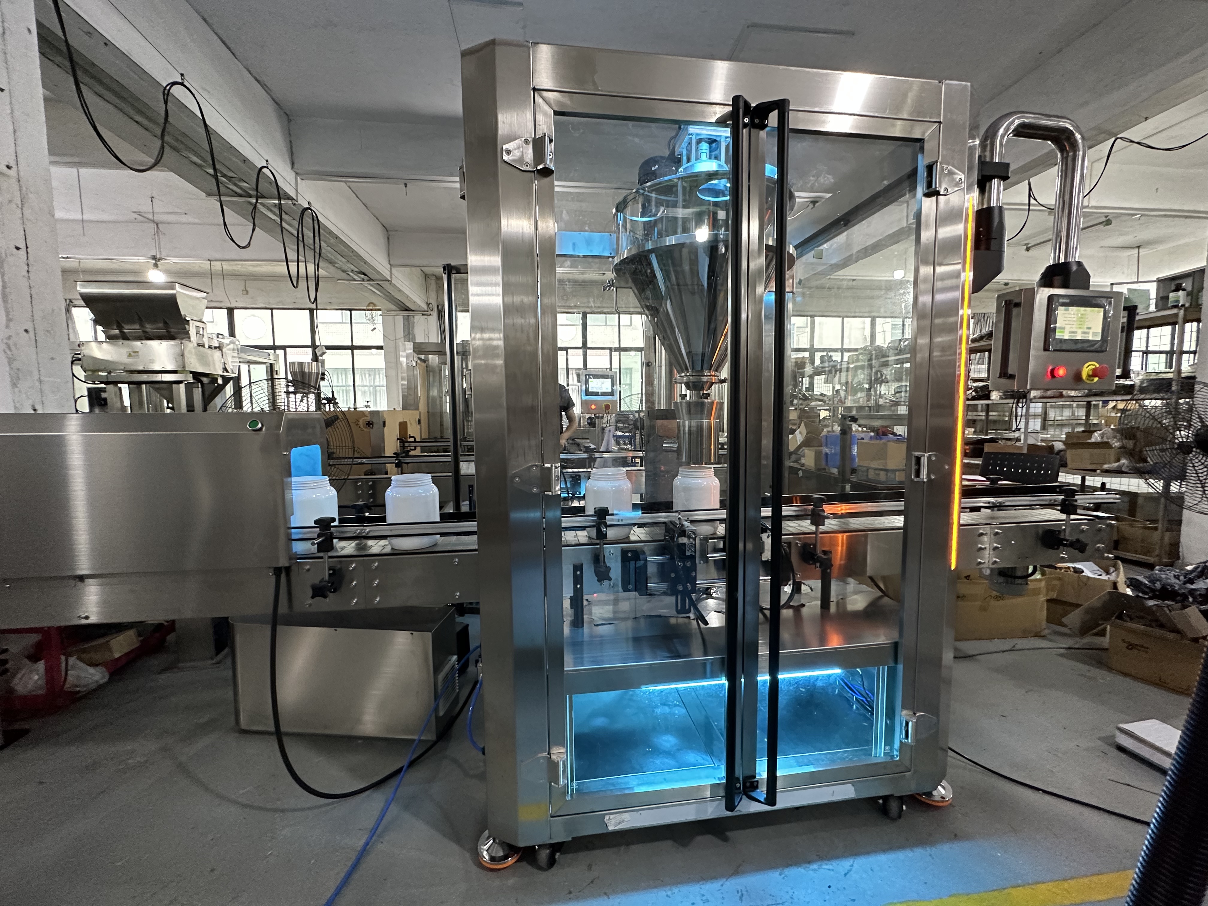 The 254nm UV-C tunnel eliminates 99.9% pathogens on cans in 8 seconds (per ISO 11137). Filling module features servo-driven auger with ±1% accuracy (5g-5kg range) and anti-bridging vibration technology. Constructed with 304 stainless steel and HEPA-13 filtration, maintaining Class 100K cleanliness.