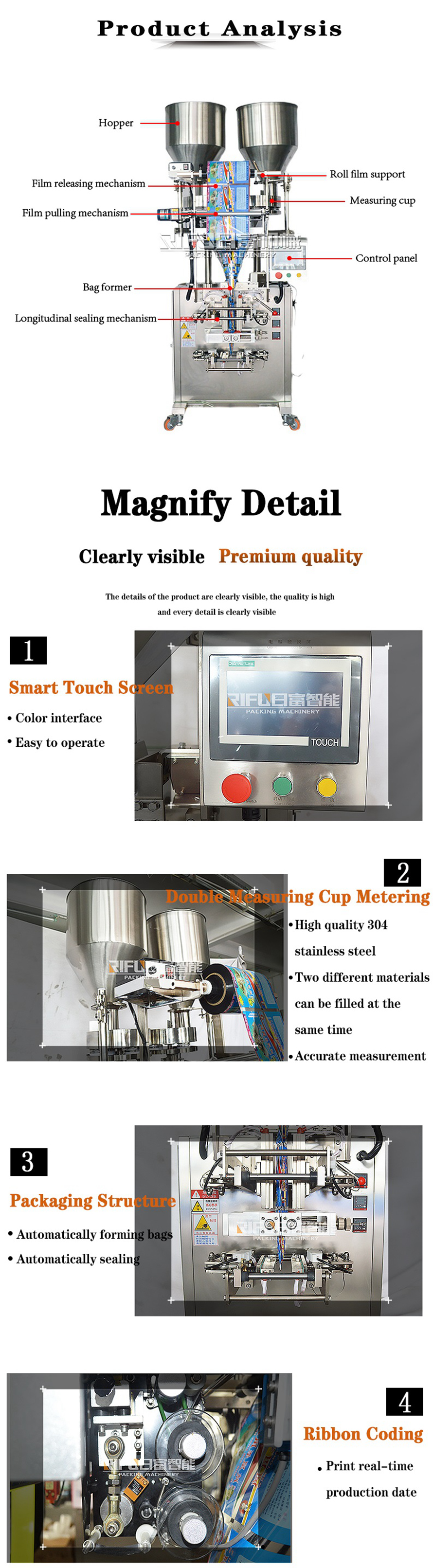 The machine is suitable for the food, medicine, chemical industry, cosmetics industry of particles of measurement packing.All the works of bag making,measuring,filling,sealing,cutting and counting can be done automatically,at the same time,it can also according to the demand of customers printing batch number and other functions.