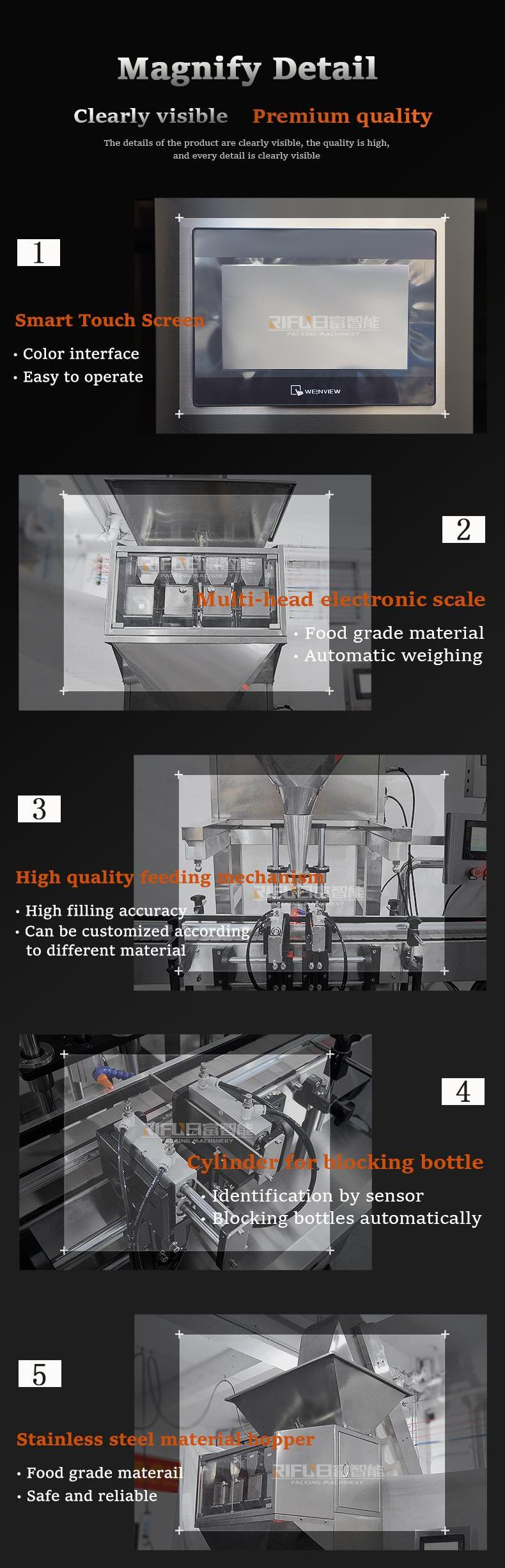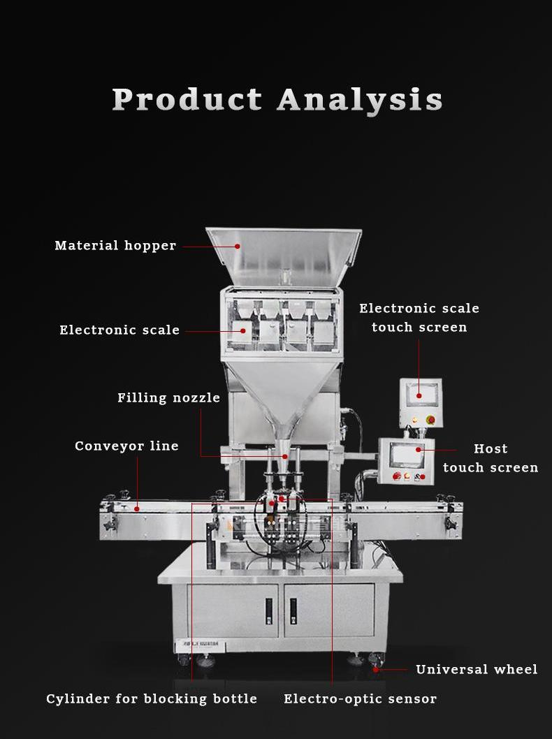 This equipment is suitable for filling ric, peanuts, nuts, corn, solid beverage, white sugar, coffee, glucose, pills, washing powder and other granular material or expanded granular material. It can automatically complete metering and filling work.Widely used in medicine, food, daily chemical and other industries.