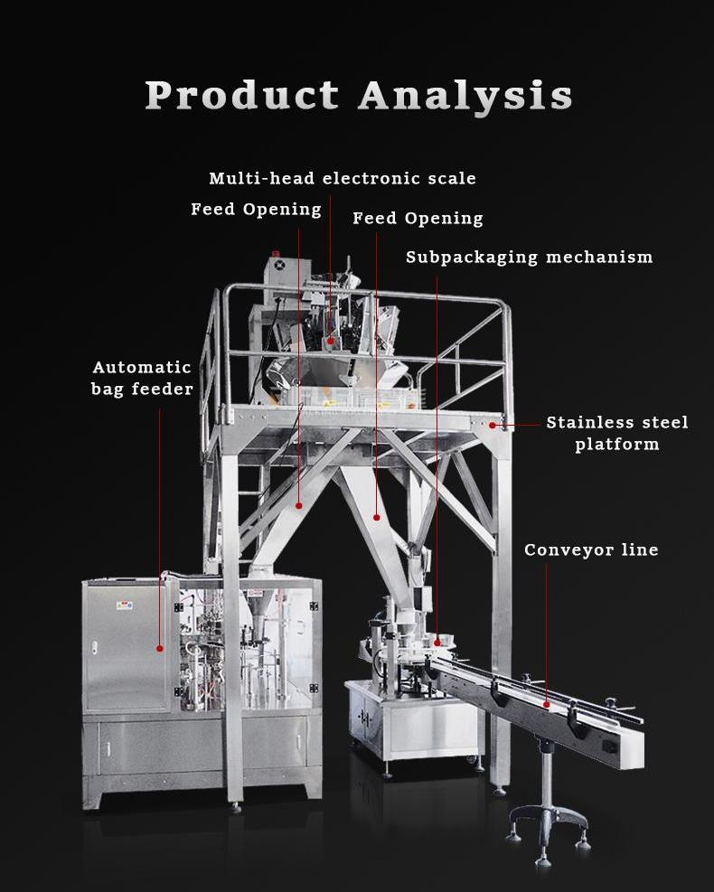 This machine is suitable for automatic packaging of granular powder particles in food, pharmaceutical, chemical, pesticide and other products. Such as: peanuts, melon seeds, potato chips, peanuts, oatmeal, desiccant, washing powder, tea, coffee, sugar and various sugar-free loose granules and so on.