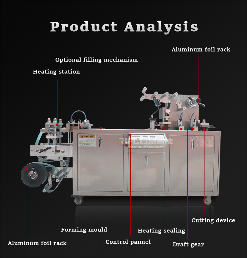 The blister packing machine is suitable for capsule, tablet, big honey pills, candies, liquids, pastes, syringes as well as irregular shape al-plastic, paper-plastic composite and al-al sealing packing in pharmacy, healthcare, food, cosmetics, medical equipment industry etc. This machine adopts micro-computer PLC, frequency converter, touch panel operation, with high automation.
