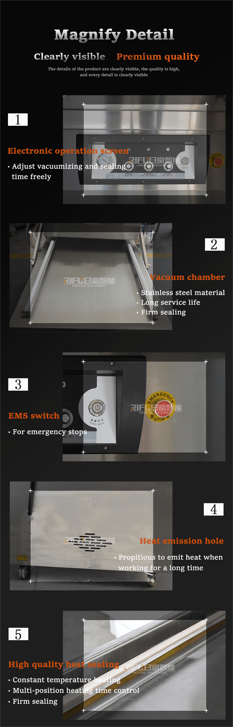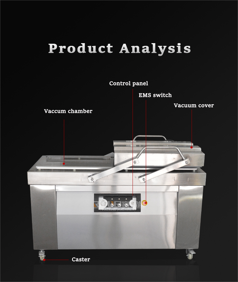 2. Big vacuum chamber and long seal. 3. IP65 grade, and flat work table. User can clean it easily. 4. Function: Vacuum+seal. It prolongs store life of your products. 5. Accept customized requirements for deep vacuum chamber, automatic swing lid, control panel, vacuum pump, gas filling, full 304SS, etc.