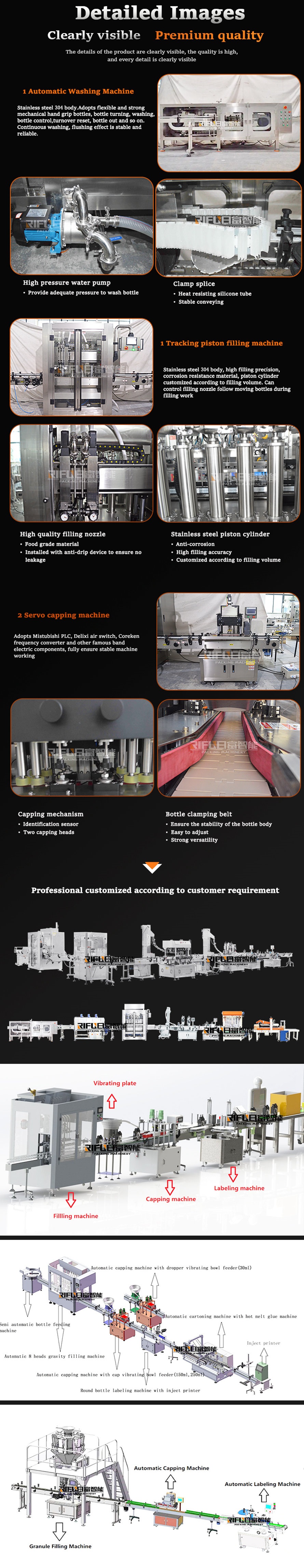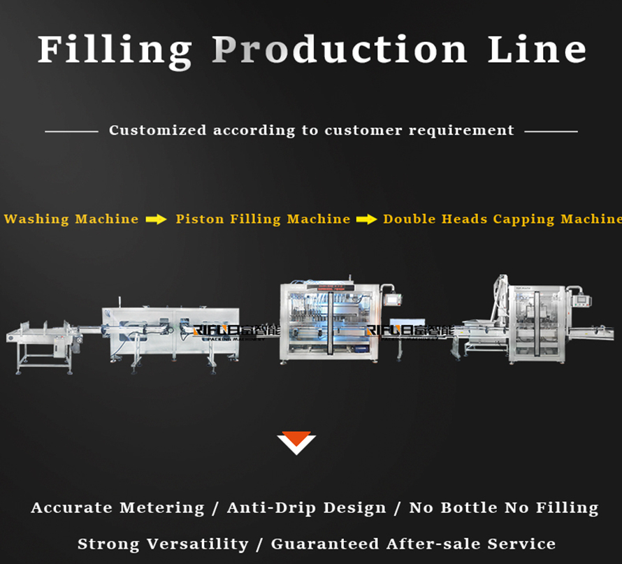 The filling production line is suitable for filling viscous liquid material, such as ketchup, oyster sauce, jam, chili sauce and so on. The whole line can complete washing filling and capping at one time. With international famous brand electrical and pneumatic components, it works very stably. Automatically controlled by PLC, the touch screen displays the working status and operation instructions in English, which is simple and clear. High-quality stainless steel frames, very easy to clean and maintain.