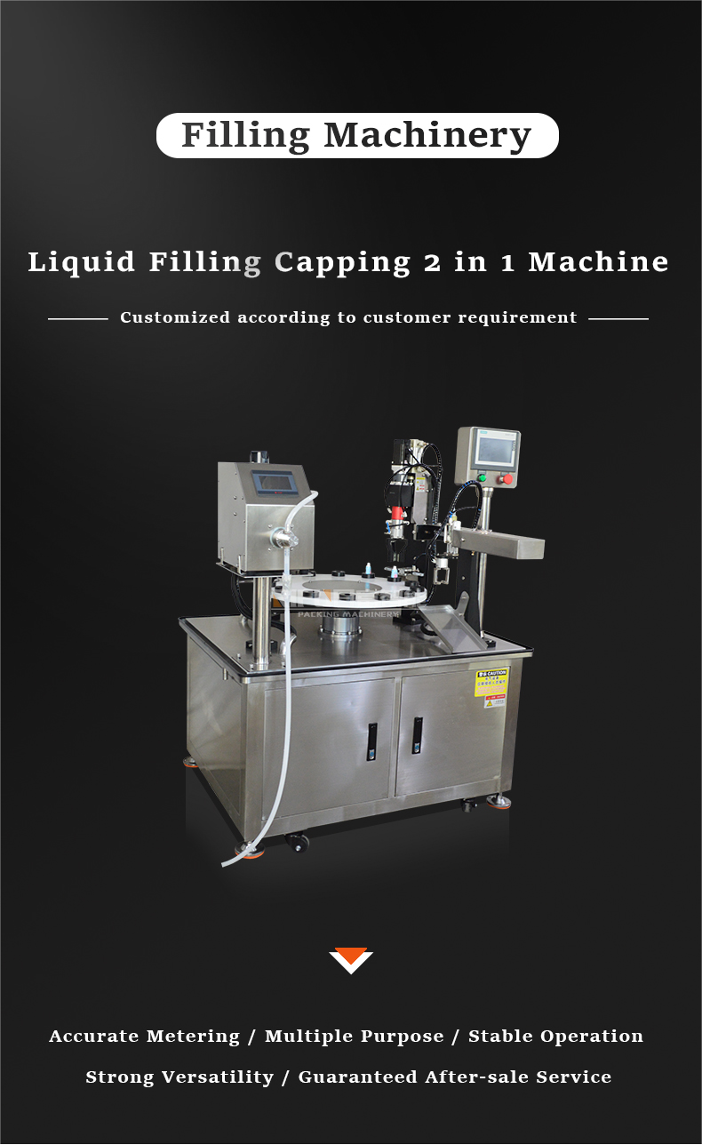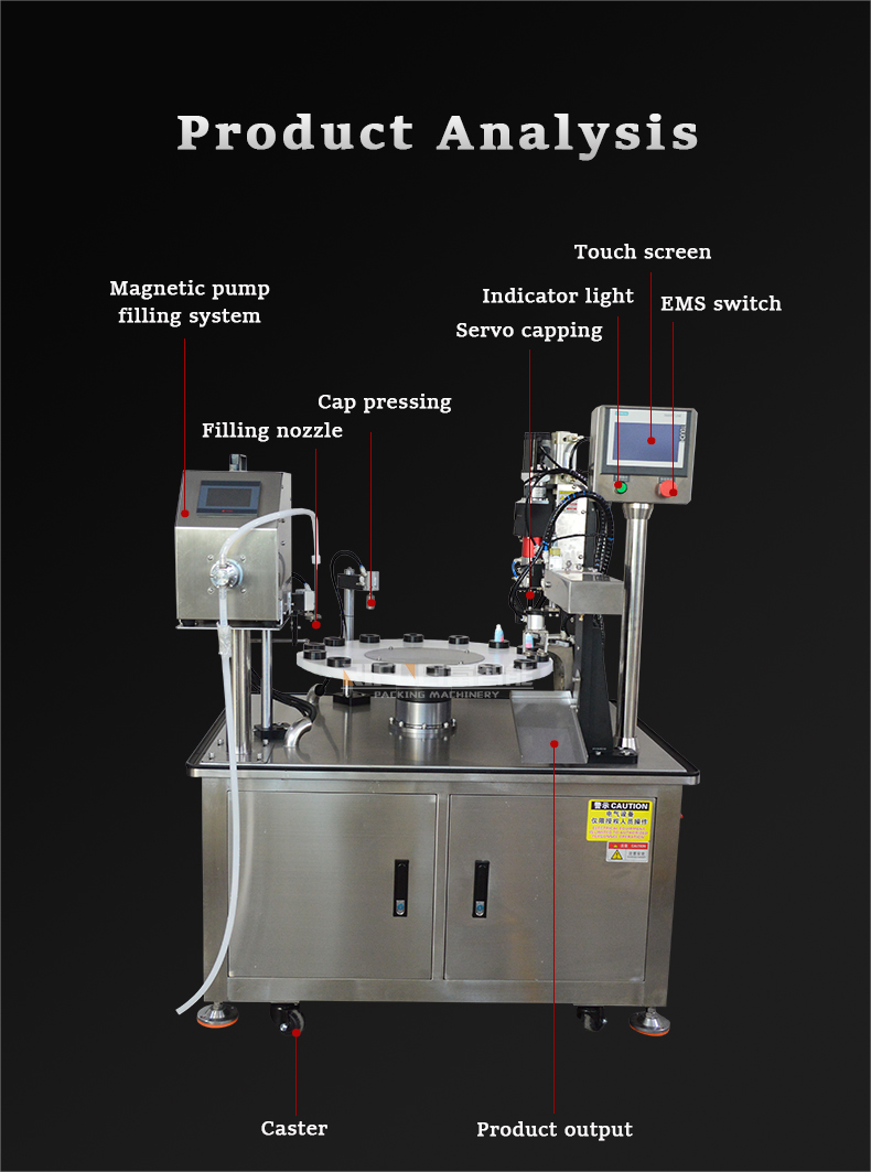 The liquid filling capping machine is suitable for packing eye drops, oral liquid, potions, and other liquid products, which can automatically complete the actions of filling, feeding, plugging, capping, etc. Equipped with the magnetic pump filling system, ensuring high filling precision. And this machine meets GMP requirements.