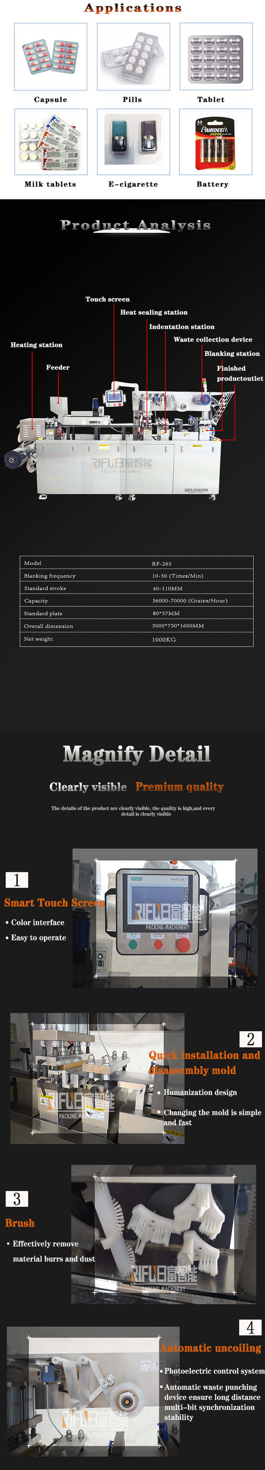 Tablet / Capsule / Pill Blister Packing Machine is a latest high-precision medicine packing machine in current pharmacy industry.it is widely used for packing capsule, tablet, honey pills in pharmaceutical industry, for milk tablet, candy, chocolate in food industry. it is also widely used in electron or hardware industry as all kind of shapes of AL-AL,AL-Plastic, paper-plastic combined sealing packing.