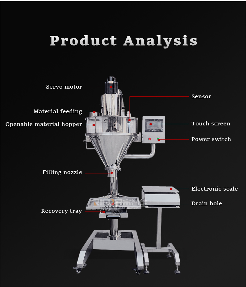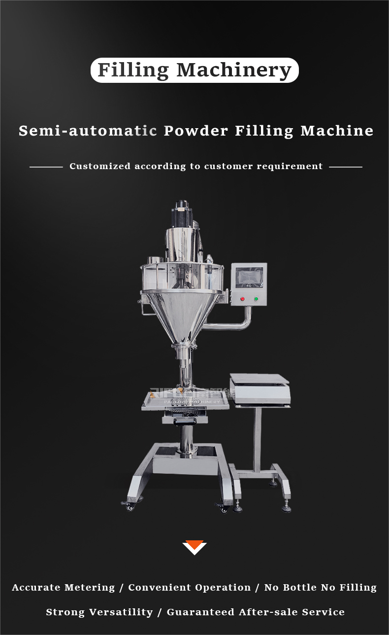 Semi automatic powder filling machine is suitable for packing coffee powder, flour, condiments, solid beverages, veterinary drugs, glucose, medicine, powder additives, talcum powder, agricultural pesticides, dyes and other fluid or low-flow materials. It can can complete weighing and filling work.