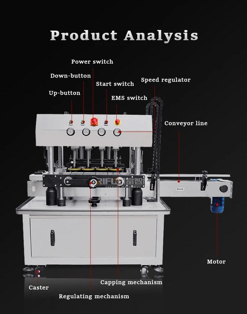 This capping machine is suitable for capping and sealing bottled products in industries such as food snacks, daily chemicals, pharmaceuticals, and chemicals. It is compatible with various cap types including threaded caps, tinplate caps, pump head caps, spray head caps, and triangular squeeze caps for sauce bottles. Customized solutions can be provided according to requirements.
