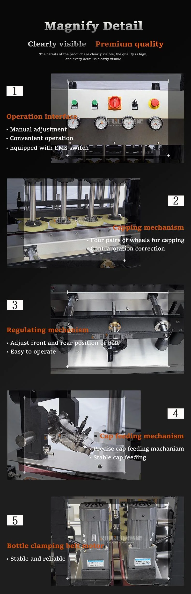 The automatic in-line capping machine is reference to the improved design of the international advanced models.High capping speed and high qualified rate.The machine has function of good flexibility.It is capable of capping accurately and rapidly any cap,such as trigger cap, metal cap, flip cap and so on.Four speed regulating motors are used for feeding cap,nipping bottle, conveying and screw cap respectively.The machine has a high degree of automation.When change the bottle and cap,only needs to simply adjust the machine.