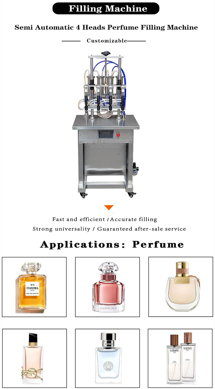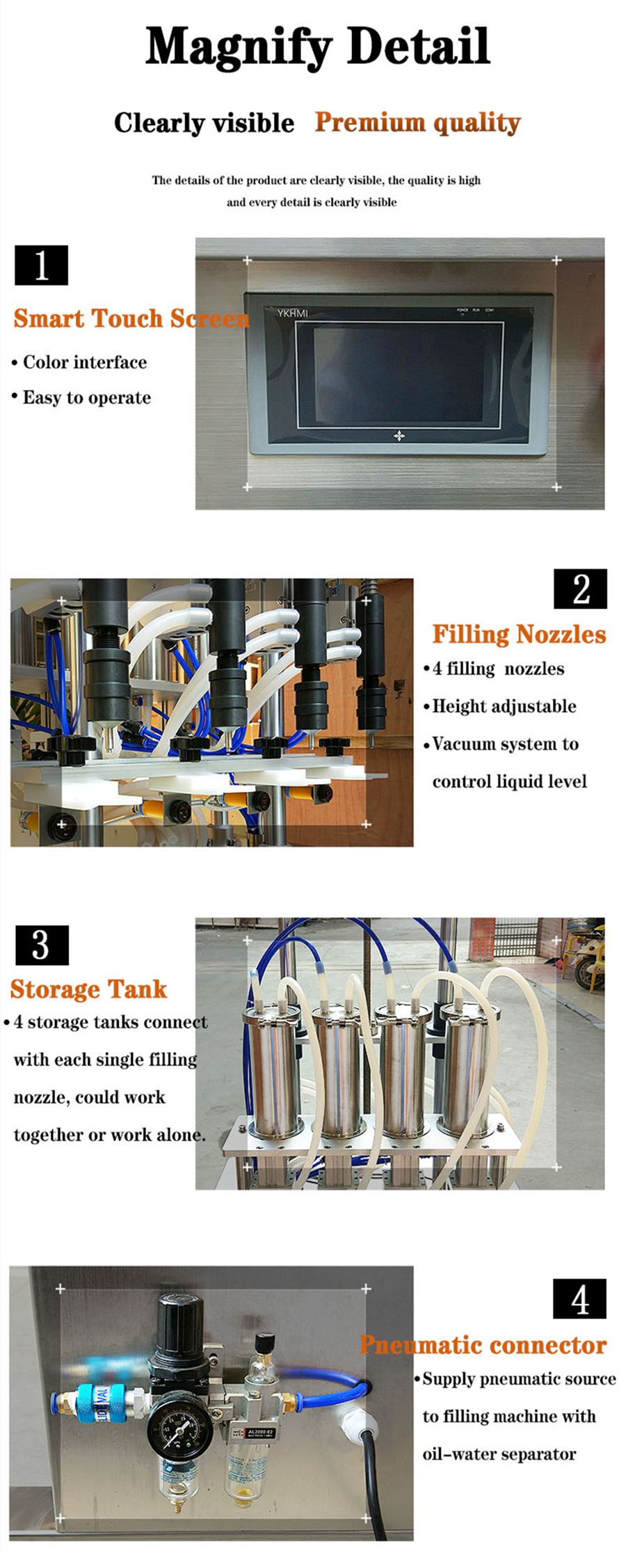 The semi-automatic vacuum negative pressure filling machine is purely pneumatic equipment. Using PLC time control, electric eye detection, each filling head can be separately controlled and filled,no bottle no filling.This machine has the characteristics of filling and constant liquid level.The filling head has double-layer pipes, one for filling, and the other for pumping the excess materials back into the raw material barrel. Reduce the waste of raw materials.The filling volume is determined by the depth that the filling head extends into the container,so the filling level will remain the same no matter whether the bottle volume is the same.The machine is especially suitable for filling perfume and liquid medicine.