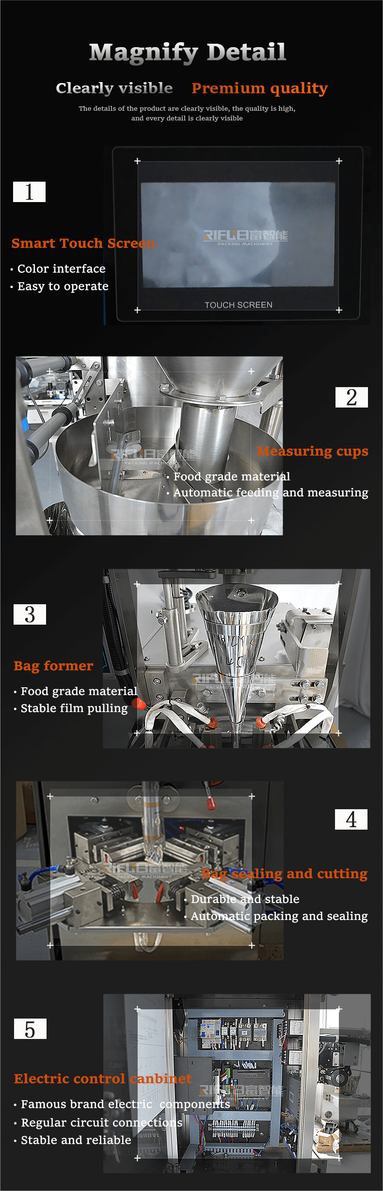 The machine is suitable for measuring and packing of particles in food, medicine, cosmetics, chemical and other industries. All the works of bag making, measuring, filling, sealing, cutting and counting can be done automatically at the same time. Printing function can also be added according to customer requirements.